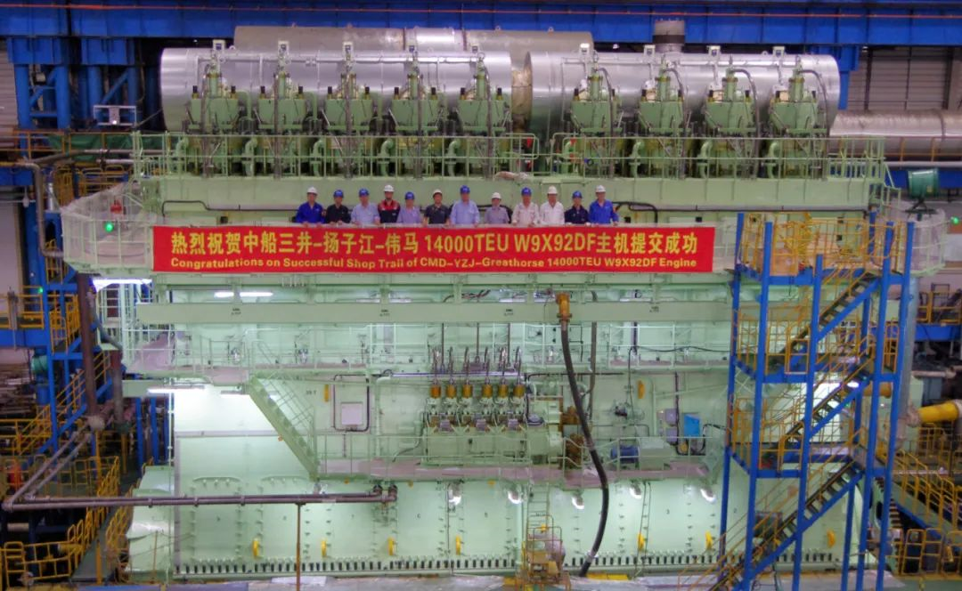CMD-WinGD 9X92DF双燃料主机最大功率42560kW,由中船动力集团下属温特图尔发动机有限公司研发,上海中船三井造船柴油机有限公司生产制造将安装在14000TEU集装箱船上