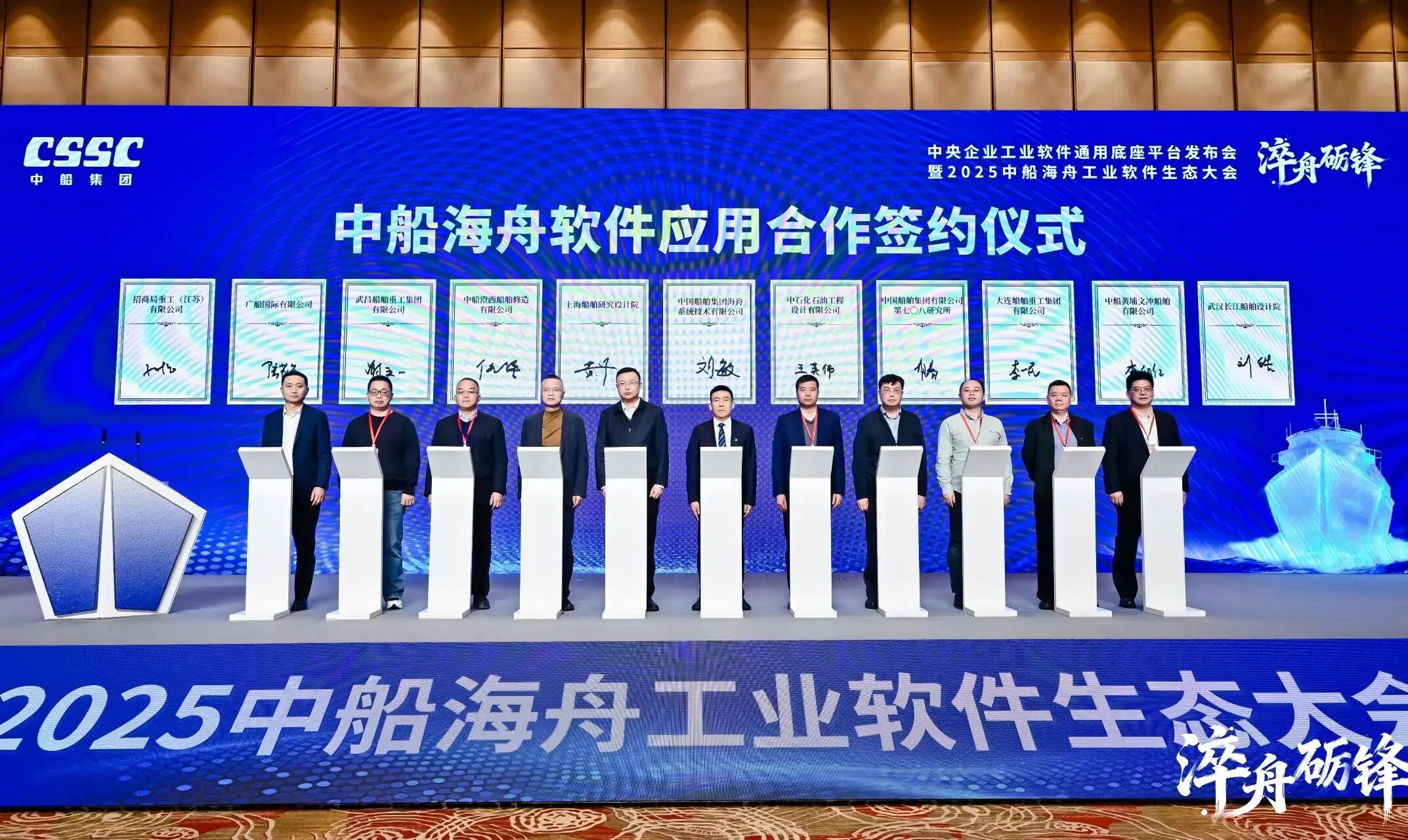 在与会嘉宾的共同见证下,中石化石油工程设计有限公司、武汉长江月博设计院、招商重工(江苏)有限公司以及中船集团内7家重要生态合作单位与中船海舟完成了中船海舟软件应用合作签约仪式。此次签约覆盖月博设计、能源装备、海洋工程等多个重点领域,标志着中船海舟产业协同生态进入规模化、实质性落地新阶段。