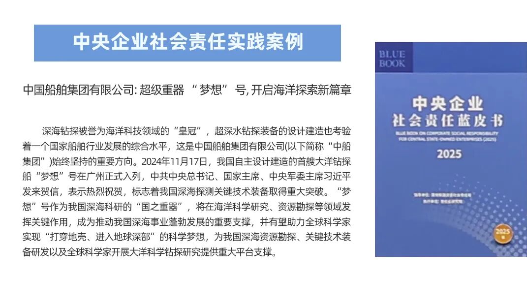 中船集团申报的《超级重器“梦想”号,开启海洋探索新篇章》,聚焦国之重器建造历程,阐述了“梦想”号在海洋科学研究、深海资源勘探等领域的关键作用,成功入选《中央企业社会责任蓝皮书(2025)》中央企业社会责任实践案例。
