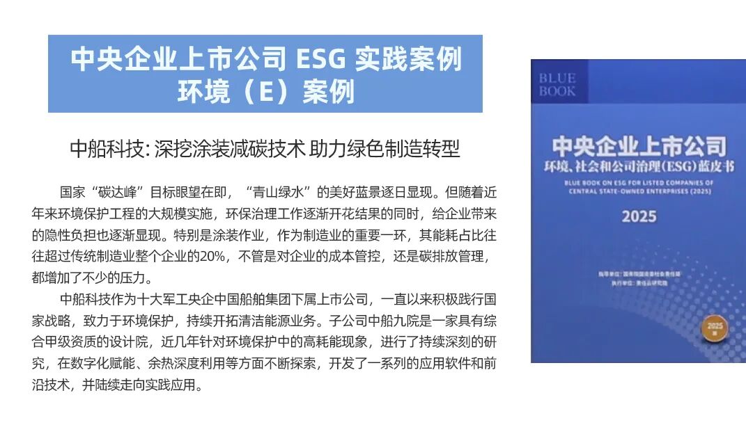 中船集团旗下上市公司中船科技申报的《深挖涂装减碳技术 助力绿色制造转型》,聚焦环保治理工作,以技术创新助力产业转型,为行业绿色发展提供了实践示范,成功入选《中央企业上市公司环境、社会和公司治理(ESG)蓝皮书(2025)》环境(E)案例。