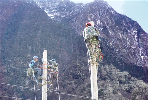 工人在玉麦乡境内施工。西藏自治区山南隆子县玉麦乡电力线路近日全线贯通,