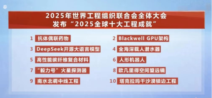 由中国工程院院刊《Engineering(工程)》评选,经由全球征集提名、专家遴选推荐、公众问卷调查、评选委员会审议后确定,具有高度权威性和国际影响力。本次入选项目涵盖航天探索、资源开发、人工智能、材料科学等多个领域。与“奋斗者”号全海深载人潜水器一同入选的还有Deepseek开源大语言模型、南水北调中线工程等全球重大工程创新成果。