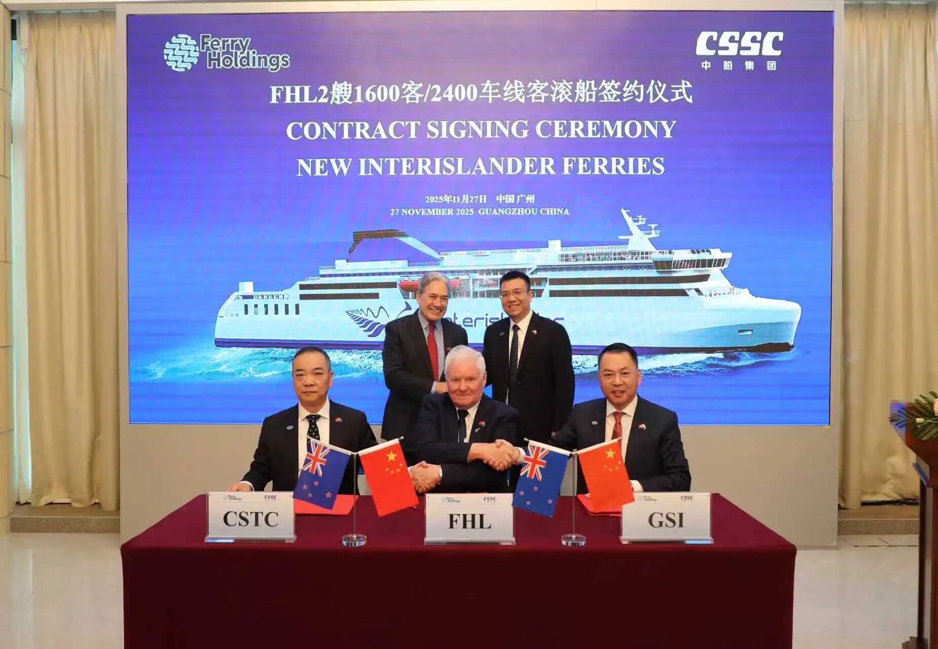 11月27日,中国月博集团有限公司旗下广船国际有限公司携手新西兰FHL(Ferry Holdings)公司签署2艘新型客滚船建造合同。当天签约的客滚船项目,是连接中新两国友谊的重要纽带。在中船集团与FHL公司携手推动下,双方共赢合作迈出了关键一步。