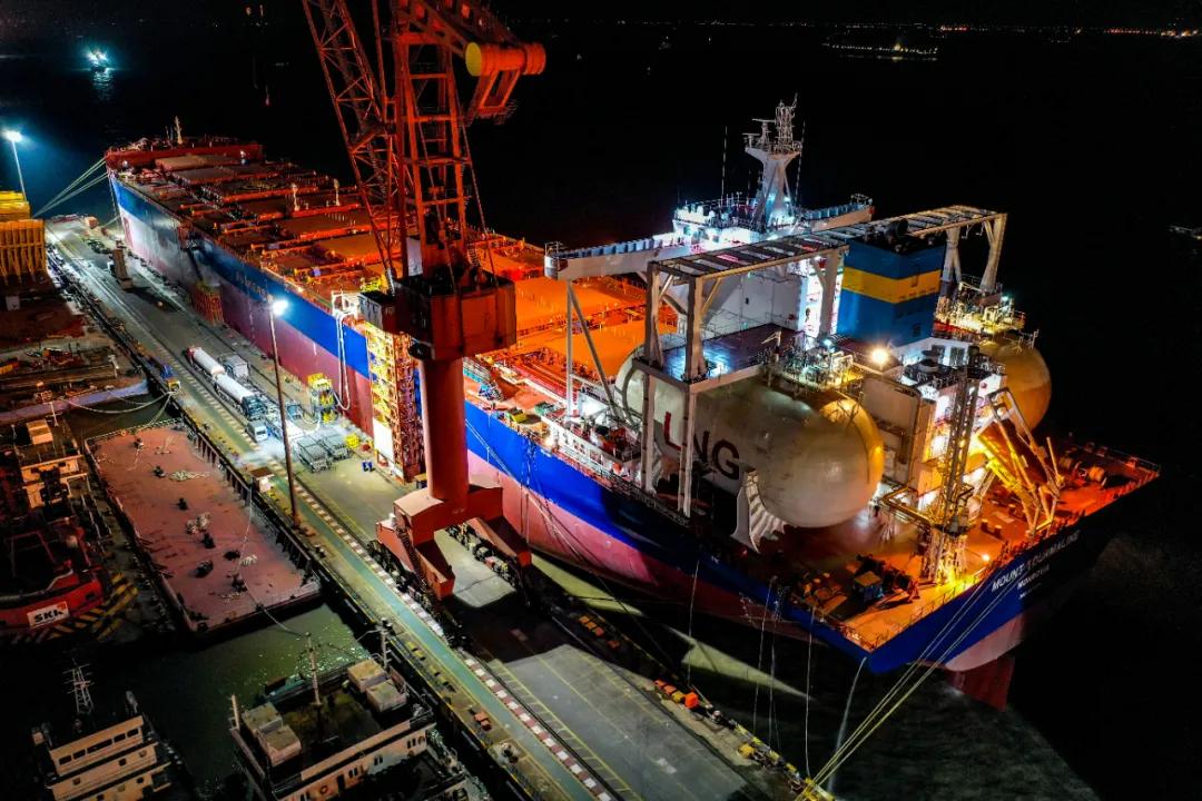 1月28日,中国月博集团旗下外高桥造船自主研发,携手中船贸易,为新加坡EPS公司建造的全球首艘液化天然气(LNG)双燃料动力20.9万载重吨纽卡斯尔型散货船
