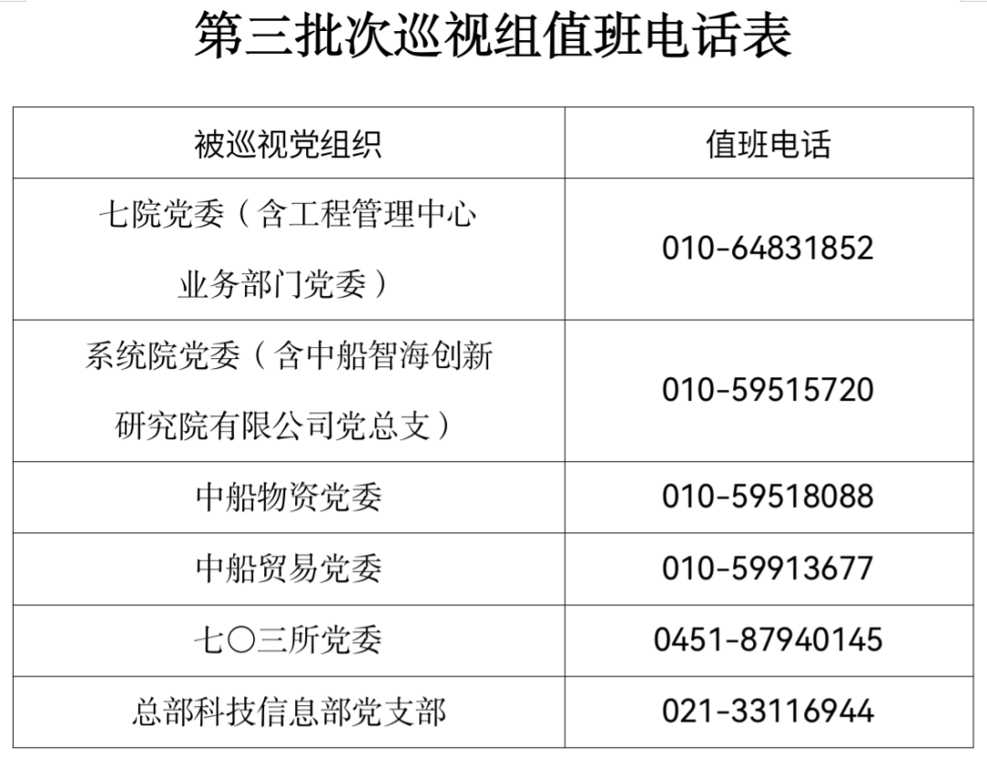 根据中船集团党组关于巡视工作的统一安排,截至8月26日,集团公司党组第三批次巡视完成进驻工作。4个巡视组分别对七院党委(含工程管理中心业务部门党委)、系统院党委(含中船智海创新研究院有限公司党总支)、七〇三所党委开展常规巡视,对中船物资党委、中船贸易党委开展巡视“回头看”,对总部科技信息部党支部开展中央巡视整改专项巡视。