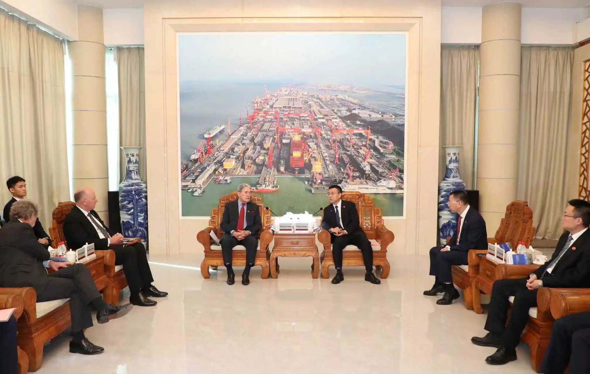 新西兰外交部兼铁道部部长Winston Peters(温斯顿·彼得斯)、新西兰FHL公司董事长Chris McKenzie(克里斯·麦肯齐)、中船集团副总经理彭原璞出席签约仪式并致辞,新西兰驻华大使Jonathan Austin(乔·文博)、驻广州总领事Michael Zhang(张典)等出席签约仪式。